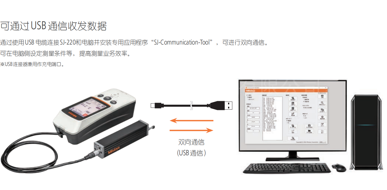 通過使用 USB電纜連接SJ-220和電腦并安裝專用應(yīng)用程序“S-Communication-1ool”可進行雙向通信。可在電腦側(cè)設(shè)定測量條件等,提高測量業(yè)務(wù)效率,※USB連接器兼用作充電端口。